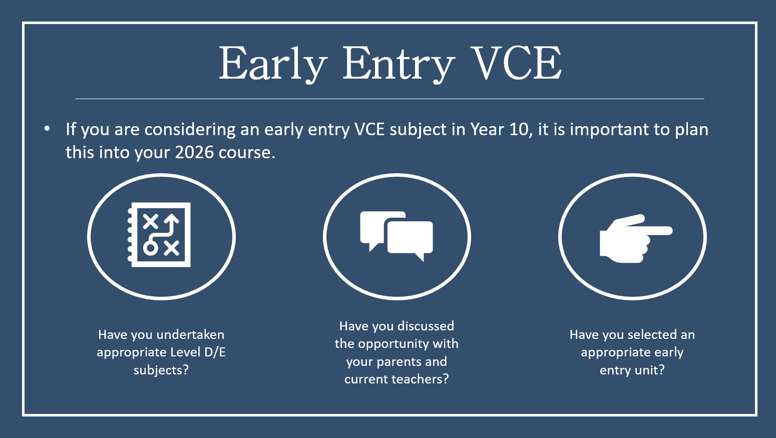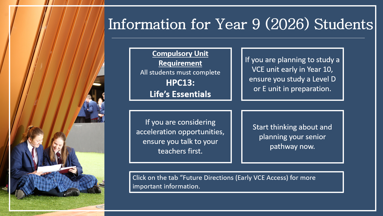 When Year 8 and Year 9 students are selecting units for Semester 2, the usual curriculum protocols apply. However, students should be aware that it is possible to include a VCE or VET (unit one/two) subject, when undertaking Year 10 in the future.
