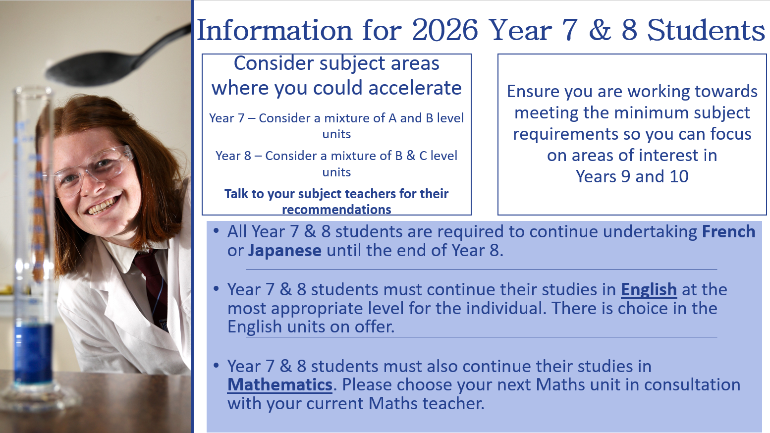 Teachers and leaders consider many factors when considering applications to accelerate. Approval to accelerate is not automatic. Students will be advised on pathways best suited to their learning and preparation for VCE.
