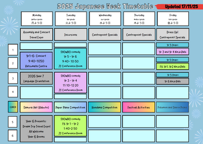 Next week is Japanese Week in the Junior School. Many activities are planned, including classroom activities, comedy show, lunchtime activities, and a dress-up day just to name a few.