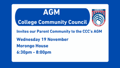 We warmly invite all parents to support the Kardinia community by attending TONIGHT’S Annual General Meeting of the College Community Council - CCC. This is a wonderful opportunity to:
