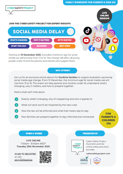 To help parents and children under 16 understand what's changing, why it matters, and how to prepare together, we invite you to an online information session presented by the Cyber Safety Project.