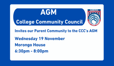 We warmly invite all parents to support the Kardinia community by attending the upcoming Annual General Meeting of the College Community Council - CCC. This is a wonderful opportunity to: